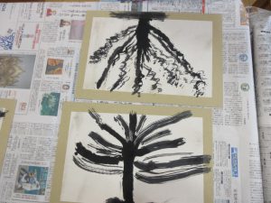 4月のテーマは「さくら」。まずは、墨を使って木の幹を描きました。