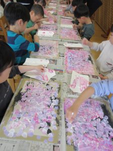 そして、絵の具でさくらのはなびらを描きました。タンポを使ってでポンポンと押していくと、満開のさくらになりました。